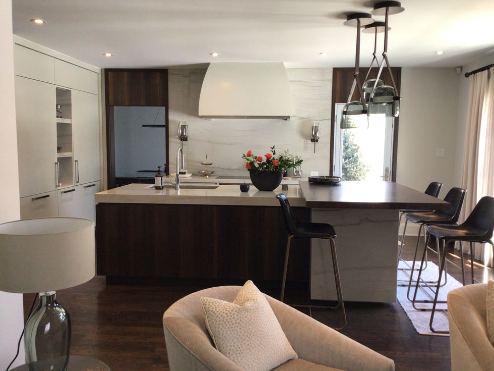 Réalisation d’une cuisine en mélange d’eucalyptus fumé et de particule de bois laqué, avec